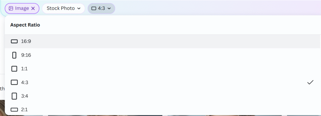 2. Aspect ratio options: Square (1:1), Landscape (16:9), 9:16, 4:3, 3:4, 2:1.